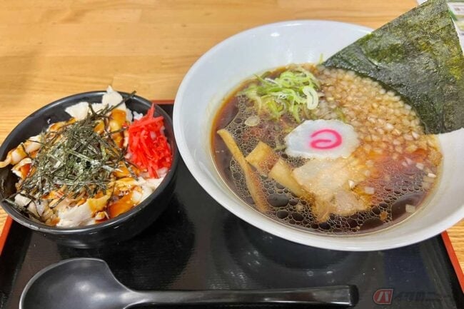 色も味も濃い!! 「黒醤油ラーメン」にセットの「鶏めし」まで!? バイクで行く高速道路グルメ 東関道「湾岸幕張PA」