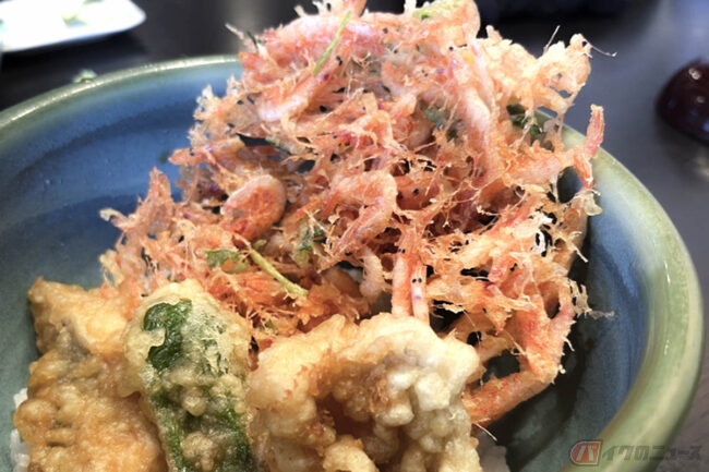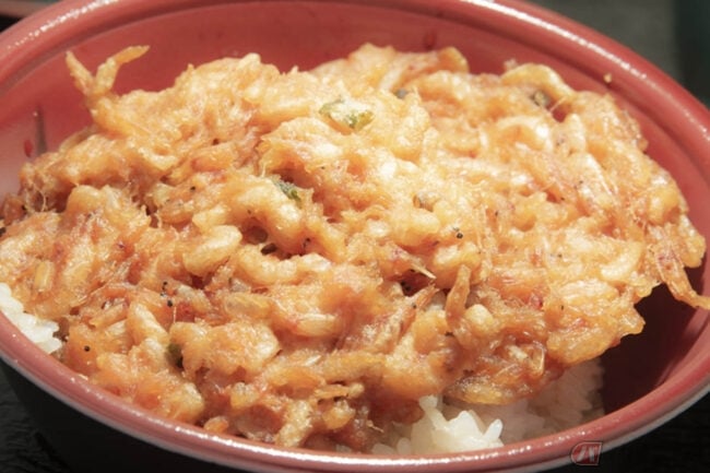 旬の桜えびがギッシリ!! 由比港漁業協同組合が運営している「浜のかきあげや」はツーリングにピッタリのグルメスポット!! 名物「かきあげ丼」に「生桜えび丼」も