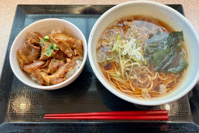 2025.05.24朝の割と早い時間帯にバイクで高速道路を走っていると空腹になりがちで、朝食のためにPAやSAをよく利用しますが、そんな時には「朝限定メニュー」を選ぶのも楽しみのひとつです。東関道「湾岸幕張PA」で、温かいかけそばとミニ豚丼のセットをいただきました。