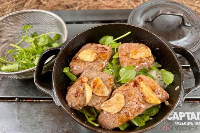 キャンプツーリングの簡単アレンジ飯 ダッチオーブンで作るクミンバターライス&ガーリックステーキ丼