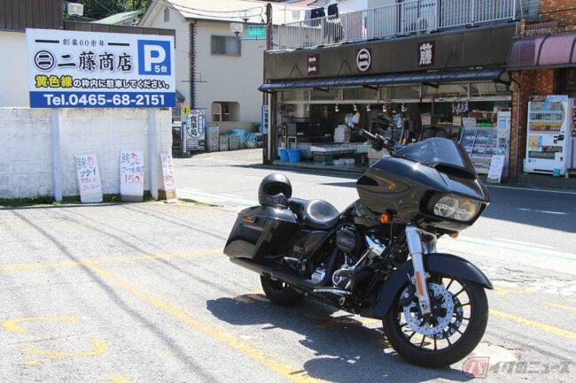 2023.04.17アジと言えばアジフライ! というライダーのために、美味しいアジフライを味わえる店を紹介します。真鶴町にある昔ながらの魚屋『二藤商店』を訪れました。
