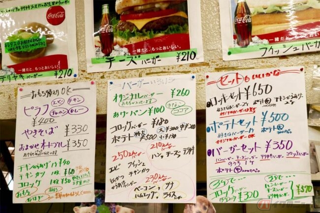 まるで居酒屋や食事処のような手書きのメニューが貼られた店内。ハンバーガー以外にも色々なメニューがある
