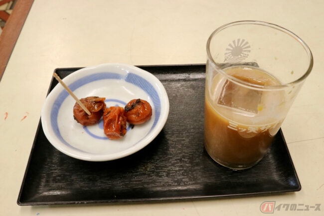 「バイクの人にはこれをどうぞ」と、ハンバーガーが出来上がるまでにいただいた梅干しと冷たいミルクコーヒー。さらに「お菓子もどうぞ」と……