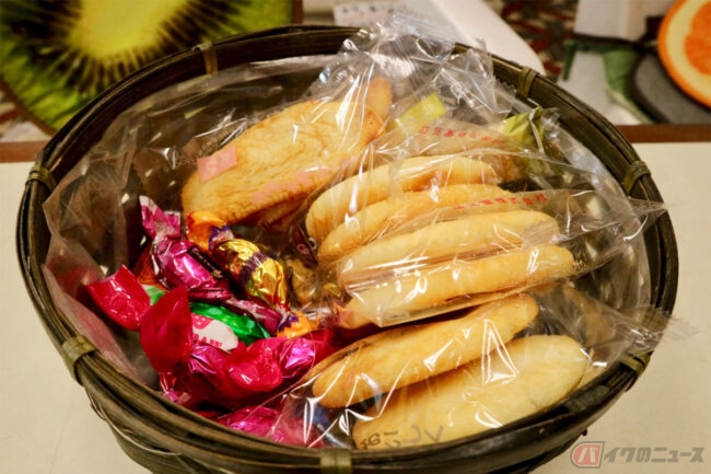 「バイクの人にはこれをどうぞ」と、梅干しと冷たいミルクコーヒーに続いて「お菓子もどうぞ」と……