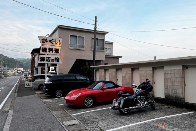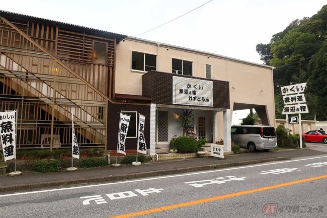 勝浦湾に面した国道128号「外房黒潮ライン」沿いにある「海辺の宿 磯料理 かくい」。店の向こう側には小さな漁港があって良い雰囲気。民宿併設で駐車場は広い