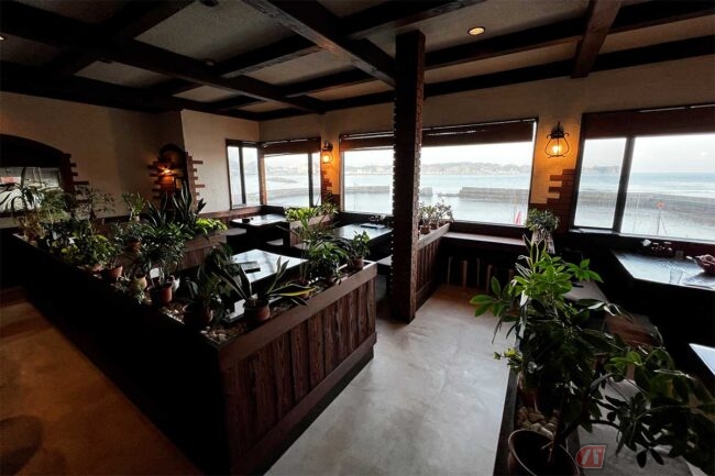 ノスタルジックな雰囲気の素敵な店内からは勝浦湾が一望できる