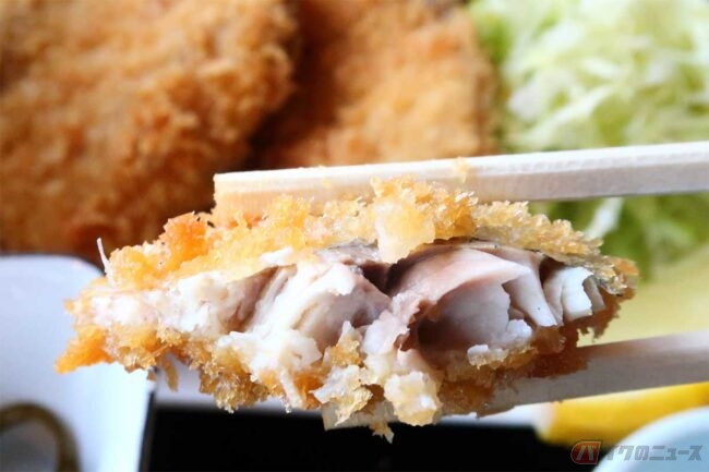 「刺身・アジフライ定食」のアジフライ。大きめで厚みもある黒潮で育ったアジのイメージ。「アジフライ定食」はアジフライが3枚