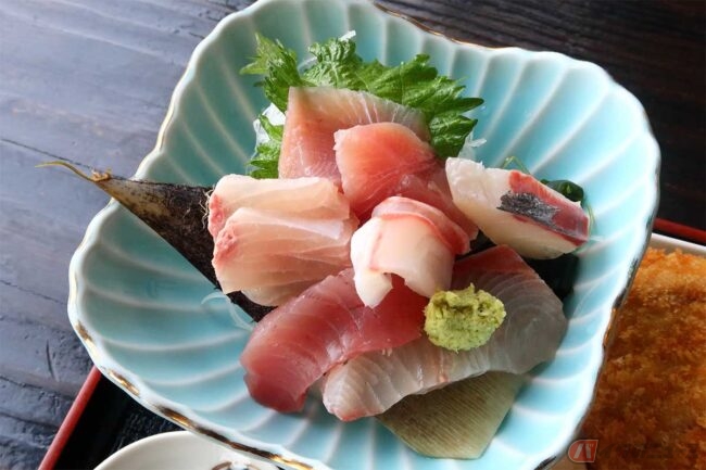 アジフライもさることながら、海を眺めながらいただく新鮮な刺身は格別の味