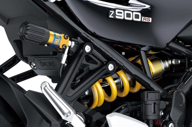 サスペンションは適度に動いて暖まるまでは動きが鈍い。写真はカワサキ「Z900RS SE」のリアショック