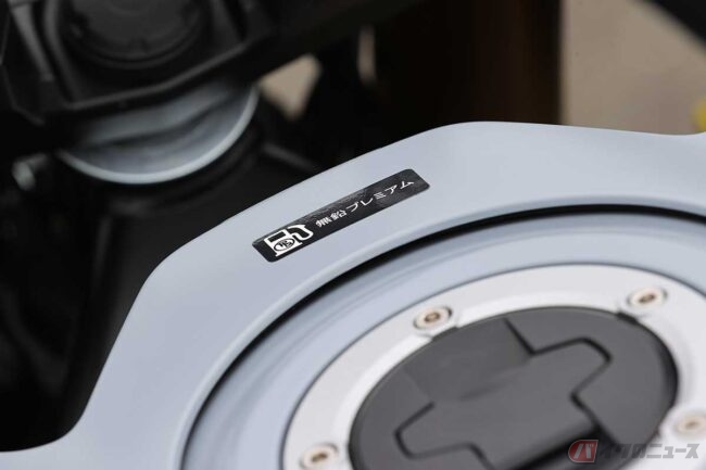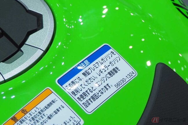 燃料タンクの給油キャップ付近に貼られた、ハイオクの指定と注意を促すステッカー。写真はカワサキ「Ninja ZX-10R」