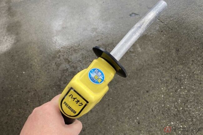 ガソリンスタンドの給油機の「ハイオク」のノズル。「PREMIUM(プレミアム)」と併記されている