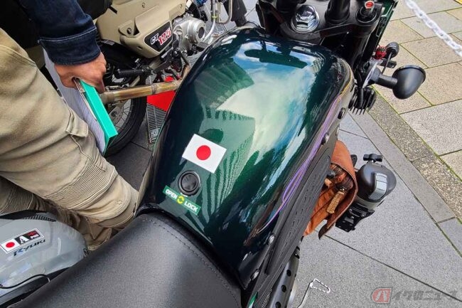 自作のダミータンクにはアルミと樹脂の合板をカットしてニーグリップ用ラバーを貼り付け