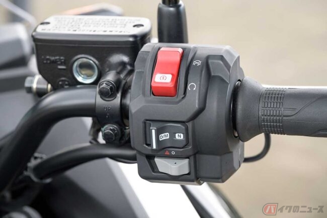 ハンドル左のスイッチボックスにはマルチファンクションスイッチを導入。モード切替スイッチのほか、グリップヒーターの調節スイッチも備わる