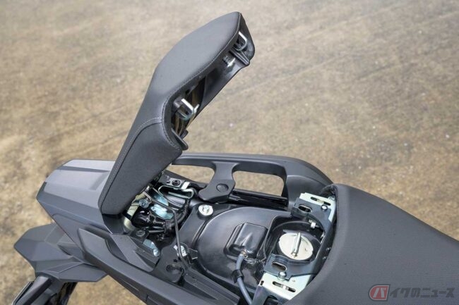 容量14Lの燃料タンクをシート下に配置するのは「NC」シリーズの特徴のひとつ。低重心化に寄与する一方、給油の際はリアシートを跳ね上げる必要があるので荷物を積載している際は少し面倒