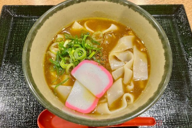 「カレーうどん」の写真が美味しそうに映る。「湾岸長島特製平麺使用」の文言が注文の決め手に