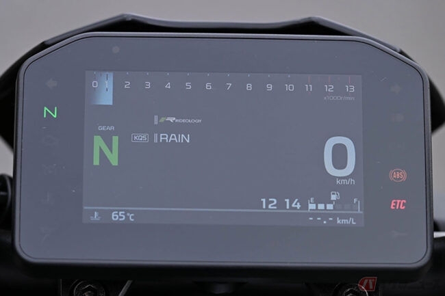 カワサキ「Z900 SE」2026年モデルのカラー液晶メーター。スマートフォンアプリ「RIDEOLOGY THE APP」と連携することで次の分岐点の方向と距離を簡潔に示すターンバイターンナビゲーションの表示も可能です