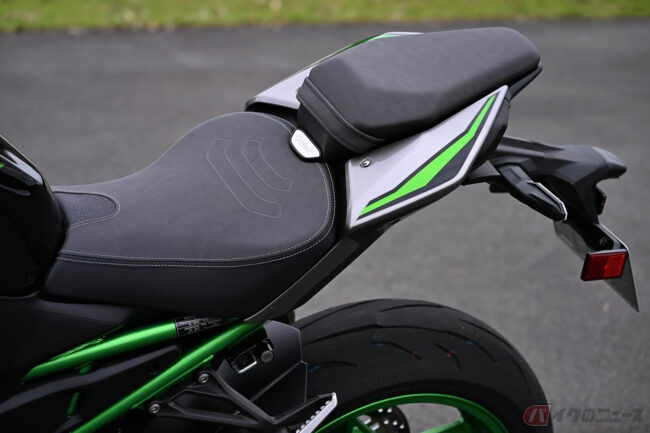 カワサキ「Z900 SE」に跨る身長175cmの筆者(青木タカオ)。シートフレームのスリム化などにより良好な足つき性を実現しています