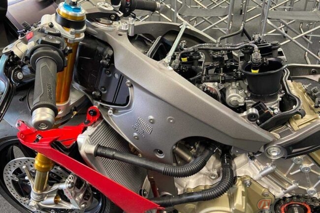 ドゥカティ「パニガーレV4S」のフレーム。エンジンとフロントフォークを繋ぐためのシンプルなパーツに仕上げられています