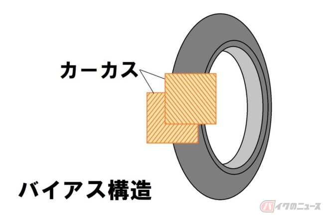 バイアス構造。カーカスの繊維の方向がタイヤの回転方向に対して斜め(バイアス)に互い違いに偶数枚貼っている。図では2枚だが、強度を増すために4枚貼っている場合もある