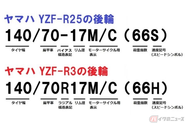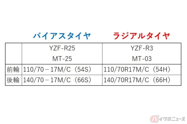 ヤマハ「YZF-R25」「MT-25」はバイアスタイヤ、「YZF-R3」「MT-03」はラジアルタイヤを履く