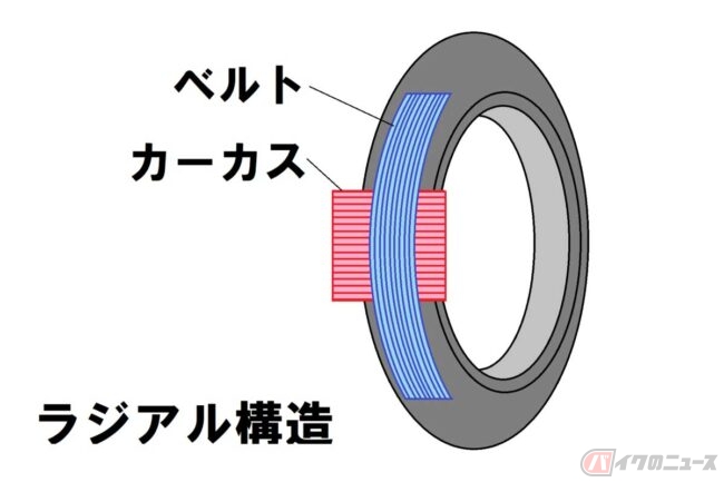 ラジアル構造。タイヤの回転方向に対して、柔軟性のあるカーカスを1枚だけ垂直(ラジアル)に貼って、その上にベルトを巻いている