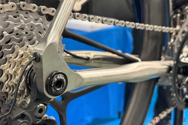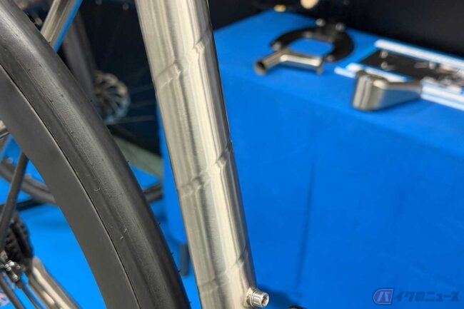 T&K「AURON(アーロン)」は、トップチューブ、ダウンチューブ、リアステー、チェーンステーに3-2.5チタン、BBシェルとシートラグには6-4チタンを使用。スパイラルシートチューブは6-4と3-2.5から選択可能。これらを使い分けることで乗り味の特徴を引き出している