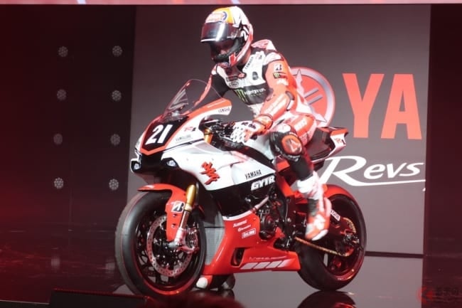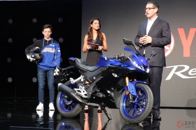「R125、R3」は、発売から20周年を迎えたYZF-R1のデザインやコンセプトを正当な血筋として受け継がれています。会場には、今年の鈴鹿8時間耐久レースで勝利した20周年記念カラーのモデルに“マイケル・ファン・デル・マーク”選手がライディングして登場しました。
