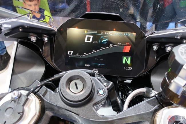 「レイン」、「ロード」、「ダイナミック」、「レース」の4種類のライディングモードを標準装備する新型「S1000RR」は、オプションで「プロモード」も用意。トラクションコントロールやABS、エンジンブレーキなどを個別に制御することが可能です。