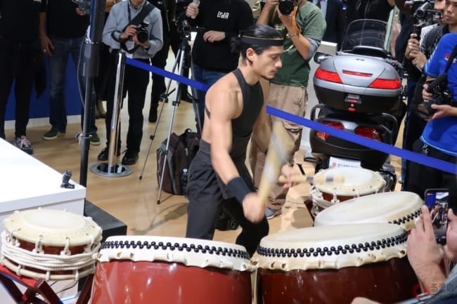 和太鼓の演奏と居合の演武で始まったスズキのプレスカンファレンスは、活気に満ちています。プレゼンテーションでは、カタナのコンセプトについて語られた後ブラックに意匠を変えたカタナがアンベールされました。