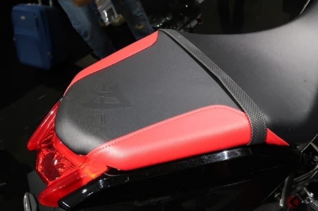 カタナのアクセサリー装着車には、カーボンクラッチカバー/カーボンクランクケースカバー、スモークが施されたメーターバイザー、赤く塗られたBrembo製キャリパー/アクスルスライダー、赤のラインと刀のロゴが施されたリアシート、ホイールを引き締めるリムデカールなど様々な装備が用意されています。