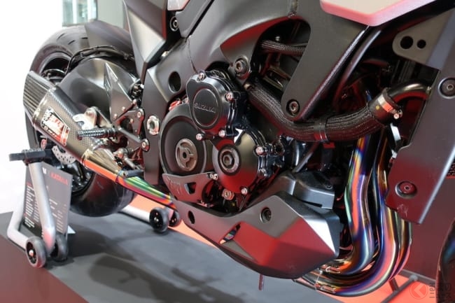 会場に展示された「Z900RS」には、「X-Tread」とレーシング手曲ストレートサイクロン「T-SPEC」が装着されており、80年代のZ系を彷彿とさせています。