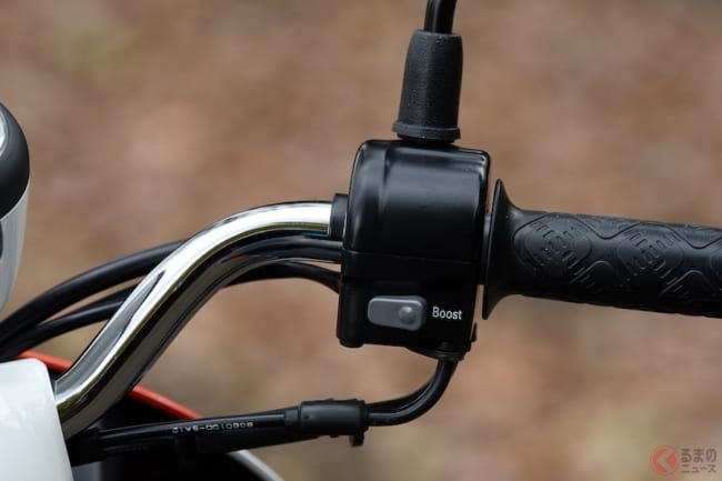 発進時に力強く、あとはジワジワとスピードが上がっていく感覚で、ここぞという加速時にはハンドル右のボタンを押すと最大30秒間作動するブースト機能があり、一時的にパワーアップしてくれるから面白い。上り坂などで重宝する裏ワザ的装置のはずですが、パワフルさが楽しくなってついつい乱用してしまう。すると、デジタル液晶メーターで目視できるバッテリー残量がみるみるうちに減ってしまうから要注意。電池残量が少なくなるとメーター内に「カメ」マークがあらわれ、モーターへの電流出力を制限し、バッテリーを温存してくれます。
