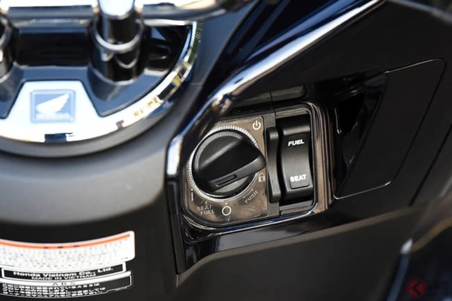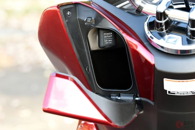 まずはハンドルまわりから見ていきます。反転液晶表示のデジタルメーターは、ブラックのカバーにブルーとリムラインがクールな印象。速度、時計、バッテリー残量などシンプルでわかりやすく表示されます。計器類が苦手な私でもパッと見て理解できます!(笑)。フロントカウル左側には小物が収納できるインナーボックスがあって、スマートフォンなどが充電できるアクセサリーソケット付き。普段使いに便利そうです。