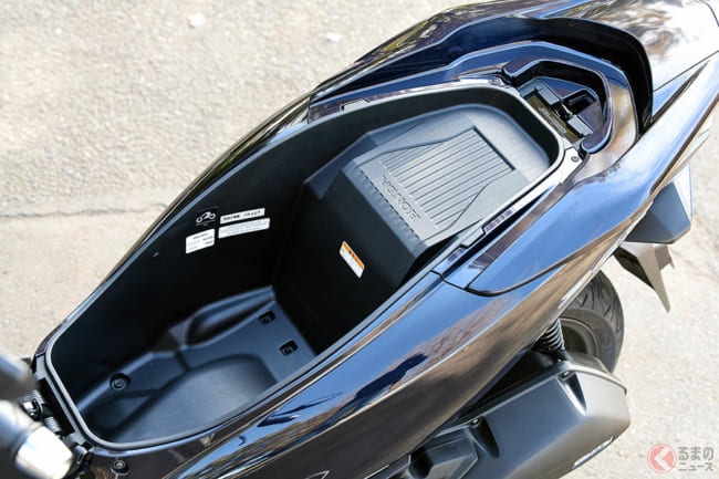 ここでチェックしておきたいのが収納スペース。シート下のラゲッジボックスには着脱式バッテリーのモバイルパワーパックが2個配置されているので、収納スペースは残念ながら小さめ。ヘルメットホルダーが1つ付属しているので助かりますが、原付二種で保育園の送り迎えをしていた私としては、もう少しスペースが欲しいところ。