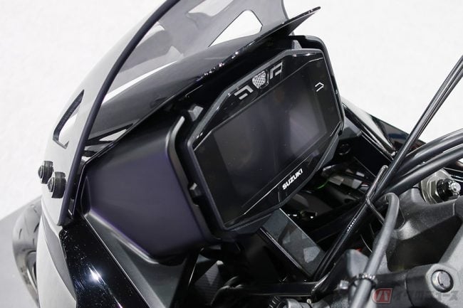 大阪モーターサイクルショーの会場には、シルバー外装モデルとは別に、メーターバイザーやカーボン製エンジンカバー、カラーシートなどの純正オプションを装着したブラック外装の「KATANA」も展示されました。