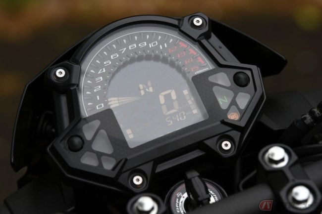 近づいてじっくりと見て気づいたのですが、緑色の塗装に細かいラメが入っていて、さりげないところでもこだわりを発見しました。ハンドルの向こうにあるスピードメーターを見ると、液晶のデジタル表示でスピードやガソリン、ギアチェンジなど、バイクの状態が確認しやすくて、初心者ライダーにとってはやさしいですね。