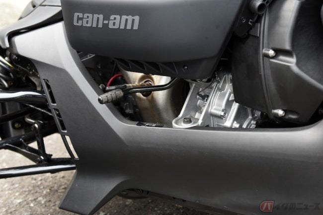 2014年前に、より大きな1.33リッターエンジン搭載の兄貴分カンナム・スパイダーが導入されてますが、インパクトではコッチの方が上! より手軽な900cc直3と600cc直2エンジンが選べ、車重も400kg前後から200kg台に半減。ギアボックスもクラッチなしのCVTとなって、格段に乗り易くなってます。