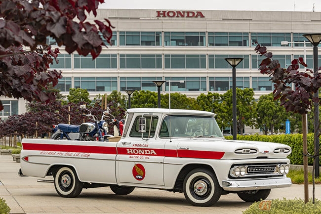 アメリカン・ホンダは、同社の60周年を祝うために、バイクの配達に使用していたピックアップトラック「アパッチ10」を当時の姿に修復し、トーランス本社に展示しました。