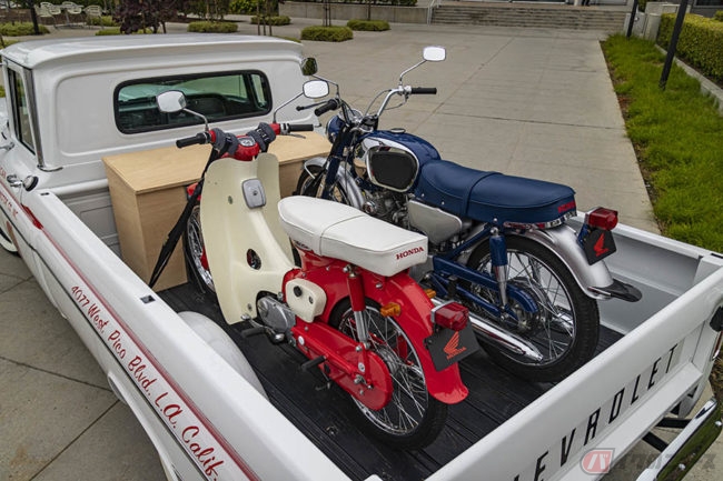 また、当時の販売員が州を巡回してディーラーをサポートするときに荷物がどのように見えたかを再現するため、荷台には世界で “スーパーカブ”として知られる「ホンダ50」と、小型スポーツバイク「CB160」が積載されました。