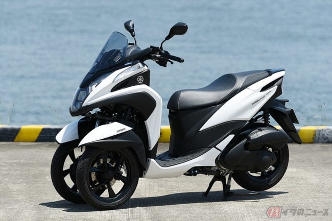 なんといっても、まずはこの外見! 以前、ヤマハが実証実験中の小型電動立ち乗りモビリティ「トリタウン」に試乗させていただきましたが、それと同じように小型スクーター「トリシティ」には前輪がふたつ備わっています。