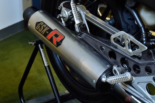 乾燥重量は、152kgと同クラスのバイクの中でも最軽量モデルとしてレース関係者にも注目されていました。また、デュアルヘッドライトを装備したフロントカウルの内側には、メーター中央部に3000回転から動き始めるタコメーターが配置され、当時の若者に印象付ける装備でした。さらに、4into1エキゾーストには、今では珍しい車体名でもあるGSX-Rと書かれています。