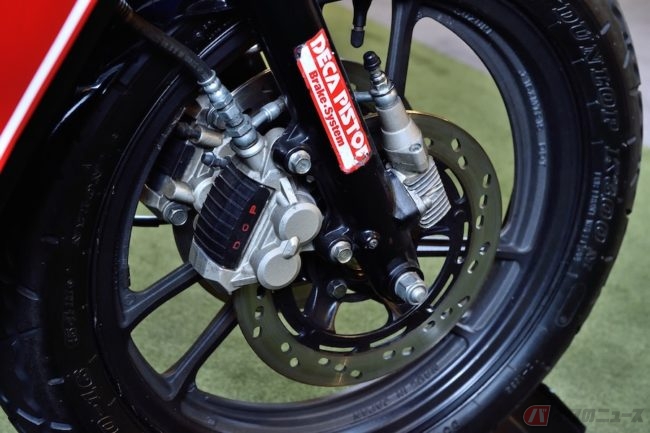前後足まわりは、フロント16インチホイール、リア18インチホイールを採用し、前8後2の10ピストンで構成されるDecaピストンブレーキシステムを採用しています。さらに、スズキが世界に先駆けて実用化したANDF(アンチ・ノーズダイブシステム)は、ブレーキ時にブレーキオイルの流れでフロントフォークの作動オイル圧を高め減衰力を大きくすることでノーズダイブを防ぎ安定感あるコーナーリングや快適なライディングを実現しました。