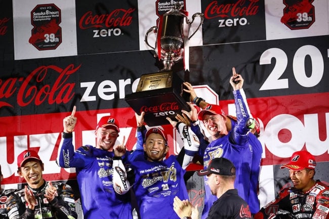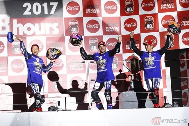 2018年は、決勝前日に中須賀選手が転倒し負傷。1998年の発売以来20周年を迎えたYZF-R1のカラーリングのマシンで、A・ローズ選手、M・ファン・デル・マーク選手の2人が、セーフティーカーも入る荒れた天候のなか199周を走り、ヤマハとして初となる4連覇を達成しています。
