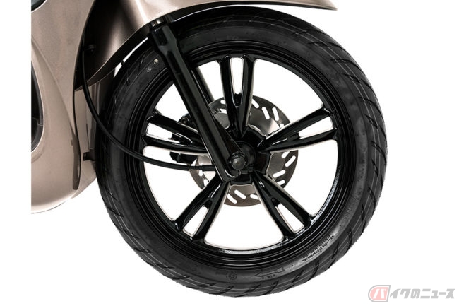 「ツイート150」は、石畳などの凸凹のある路面が多いヨーロッパでポピュラーな大径ホイールを採用したスクーターです。前後16インチホイールを装備することで、悪路や段差においてもハンドルを取られることが少なく、安定した走行ができるのが特徴となっています。
