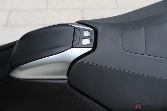 その時に活きるのが、足つき性では難があったシートです。前後左右に身体を動かすことが容易で高い自由度があり、旋回力を意のままに引き出すためのライディングポジションに貢献。下半身のホールド性にも優れ、スクーター特有のスカスカ感はありません。