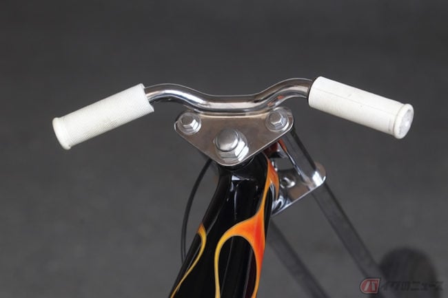 ちなみにヘッドライトやテールランプも、往年の『カミナリ族』の時代から用いられてきたCGC製の灯火類とのことで、ここもマシンのレトロな雰囲気を強調します。その他、ディテールに目をやってもフロントフォークとシンクロするような角度でセットされたアップスウィープマフラーや、白系のカラーリングで統一された大神戸共栄圏製グリップと一品もののシートのコンビネーションも製作者の高いセンスを感じさせます。一台のチョッパーとして見ると、そのバランスや完成度の高さは見事というほか無いでしょう。