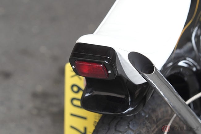 ビルダーの長谷川徹氏によると素材の年式は1975年で、その車両のTボーンフレームのプレスラインを削り取った上で溶接を施し、スムージング(表面をなめらかにする処理)。