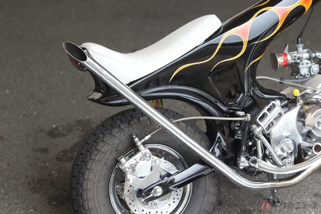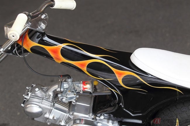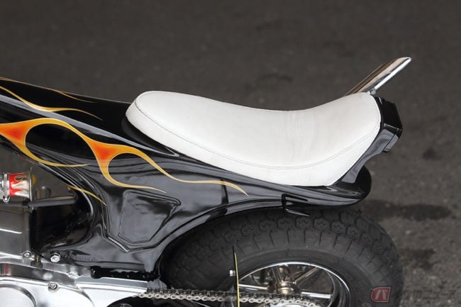 全長1365mmのホンダ「モンキー」に対して全長1510mmというボディサイズの「DAX」は、胴長短足の狩猟犬“ダックスフント”を連想させることからモデル名が付けられていますが、その特徴的なシルエットが前述の処理によって見事に強調されています。また、車両オーナーであるホールナイン・ペイントショップによるフレイムス・ペイントも絶妙です。