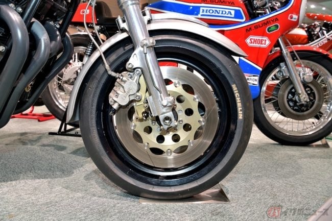 「CB750Fレーサー」に搭載されたエンジンは、CB900Fをベースにした排気量1016cc空冷4サイクルDOHC4気筒4バルブ、最高出力は140PS/10500rpmを発生させていました。さらに、フロントに16インチホイールやショーワ製NS500用フリントフォーク、RSC製キットパーツなどが採用され、RSCが手がけるマシンに仕上がっています。サイドカバーには、CB750Fと記されていますが、当時米国でも日本同様にCB750Fのみの販売だったため900Fベースのエンジンが搭載された「CB750Fレーサー」も市販車と同様のものとされました。