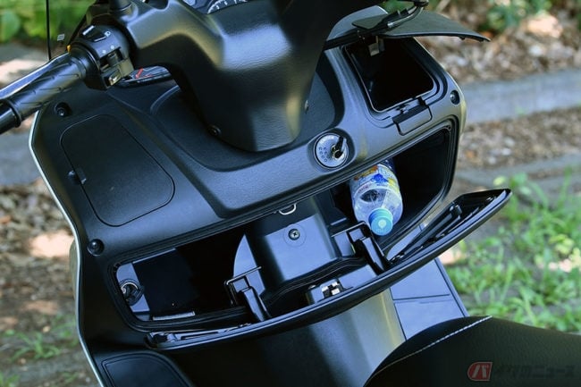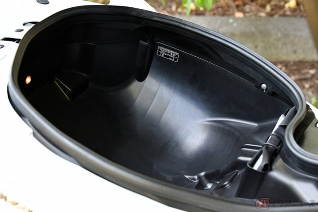 シート下の収納スペースも、かつてはゴルフバッグが入るとか大きさを競いあったものです。しかし、「バーグマン200」のトランクは広いけれど浅い形状で、ヘルメット2個を収納できると謳っていますが、1つは横向きにしてギリギリ入るかどうかという感じ。しかし、よく考えると充分ではないでしょうか。容量41L、最大積載許容重量3kg。足らなければ、トップケースを付ければいいんです。シートを開くと同時に照明が点く、優しさも付け加えておきましょう。